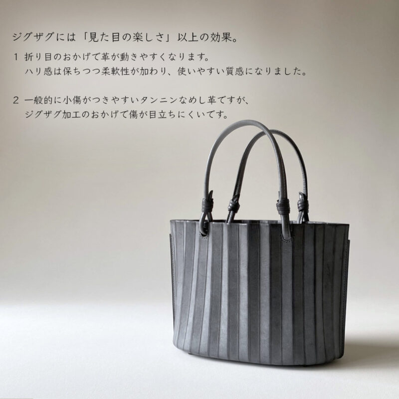 ジグザグのおかげで革荷動きがでるためバッグの口開きがよく、前回よりも荷物の出し入れがしやすいみたいです。